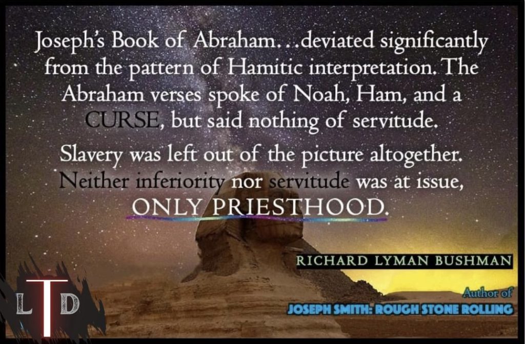 Amid this environment, the Book of Abraham (Abraham 1) emerged, offering a theological reorientation. Unlike mainstream Protestant interpretations that read Genesis 9 through the lens of racial hierarchy, Abraham 1 frames divine authority and priesthood in terms of lineage, covenant, and divine appointment, not skin color. Pharaoh’s lineage is described in relation to priesthood authority; Ham’s descendants are included in historical and covenantal narratives without any intrinsic racial inferiority.